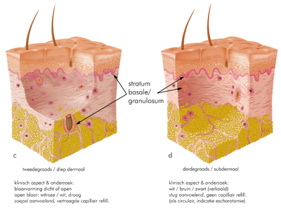 - Kleur en aspect: de wond kan variëren van roze-rood glanzend tot bleekgeel en dof tot zelfs zwart. Een volledige dikte verbranding door heet water kan ook een niet wegdrukbare kreeftenrode kleur hebben.