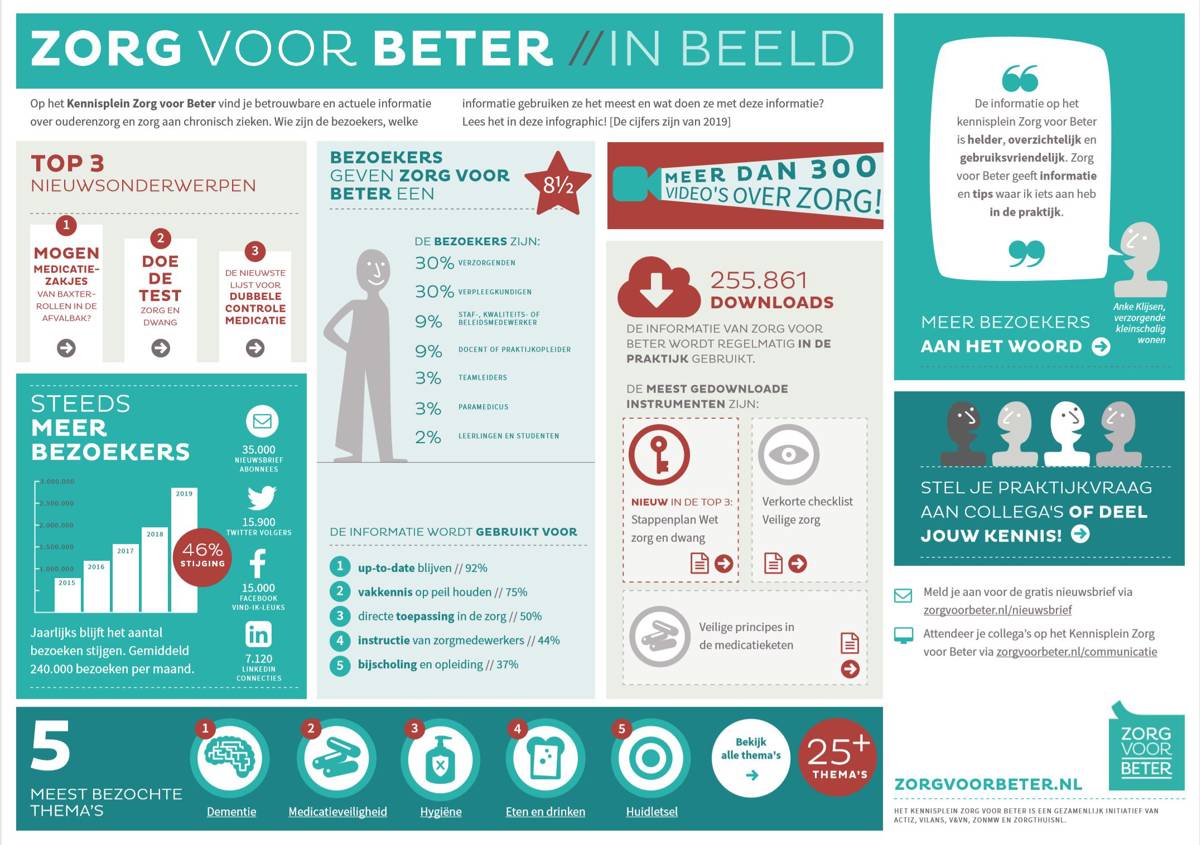 Nieuwsgierig naar welke thema's er nog meer te vinden zijn op Zorg voor Beter kennisplein? Aan welke praktische kennis, tips, nieuws, downloads en antwoord op veelgestelde vragen jij wat kan hebben? Kijk op www.zorgvoorbeter.nl