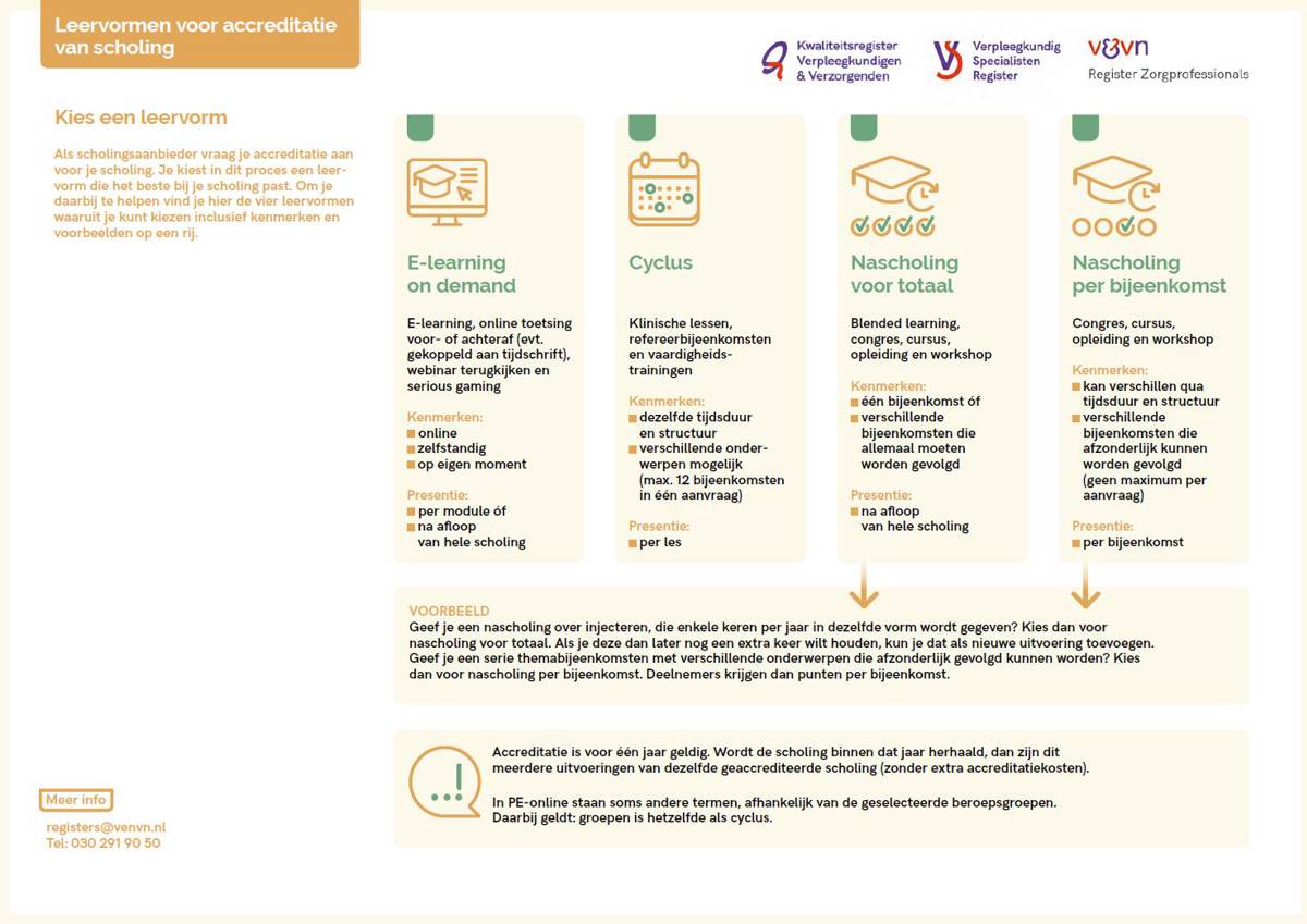 Voor het aanvragen van accreditatie voor scholing dient u in PE-online een keuze te maken uit vier leervormen oftewel nascholingstypen. Om je daarbij te helpen beschrijven wij de scholingstypen waaruit je kan kiezen inclusief kenmerken en voorbeelden: