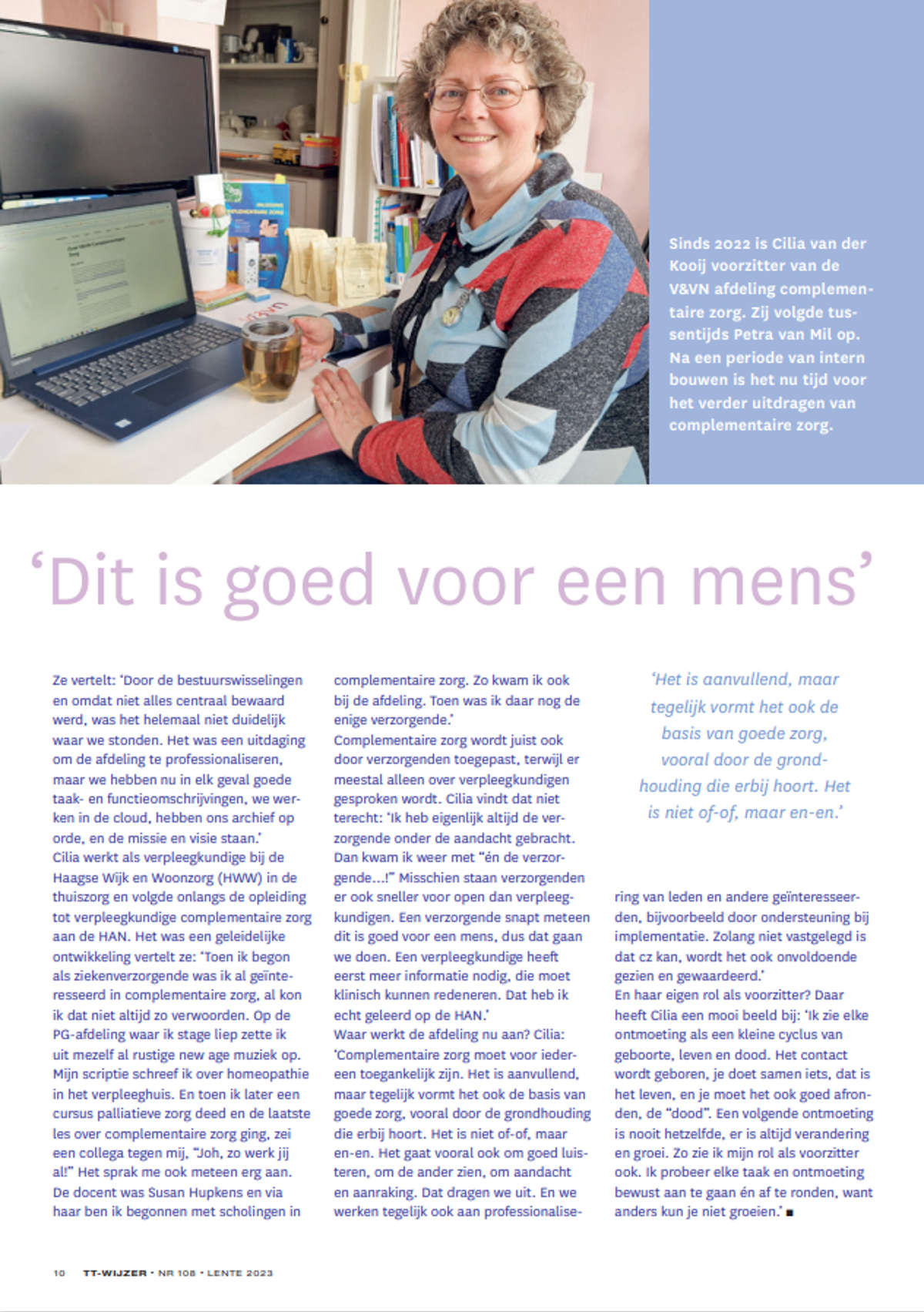 Het zesde artikel "oud" studente post hbo Verpleegkundige Complementaire Zorg aan de HAN, Cilia van der Kooij. Zij is voorzitter van V&VN, afdeling Complementaire Zorg.