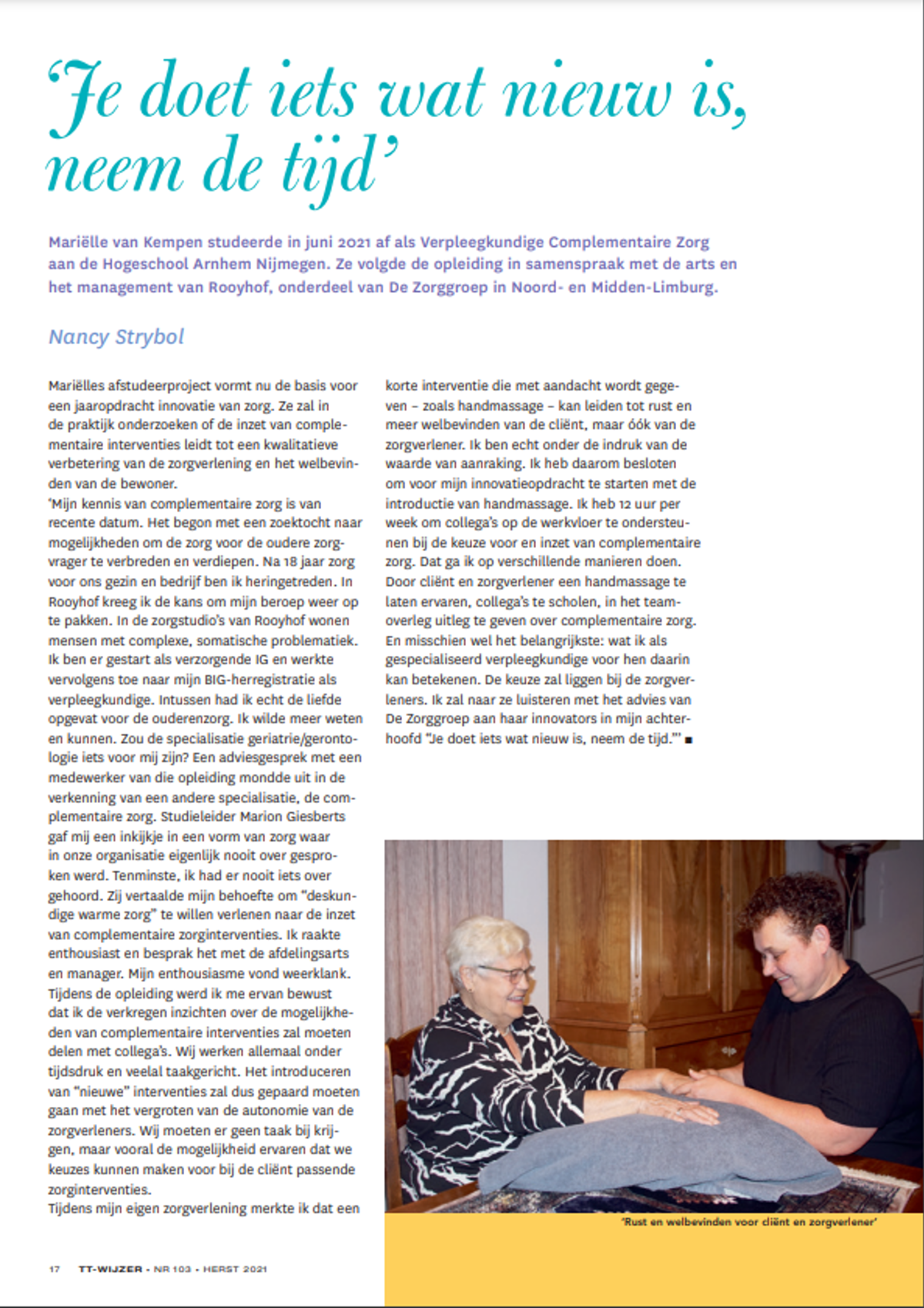 Het derde artikel betreft Marielle van Kempen. ZIj heeft de post hbo opleiding Verpleegkundige Complementaire Zorg gevolgd aan de HAN.