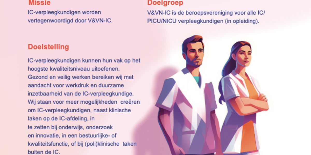 Met trots deelt het bestuur van V&VN-IC met jullie onze strategie voor de komende 5 jaar. Het afgelopen jaar zijn wij druk aan de slag geweest met onze meerjarenstrategie. Tijdens onze laatste bestuursvergadering zijn de puntjes op de 'i' gezet en de resultaten verwerkt in een infographic. Je kunt de nieuwe infographic via deze link bekijken.