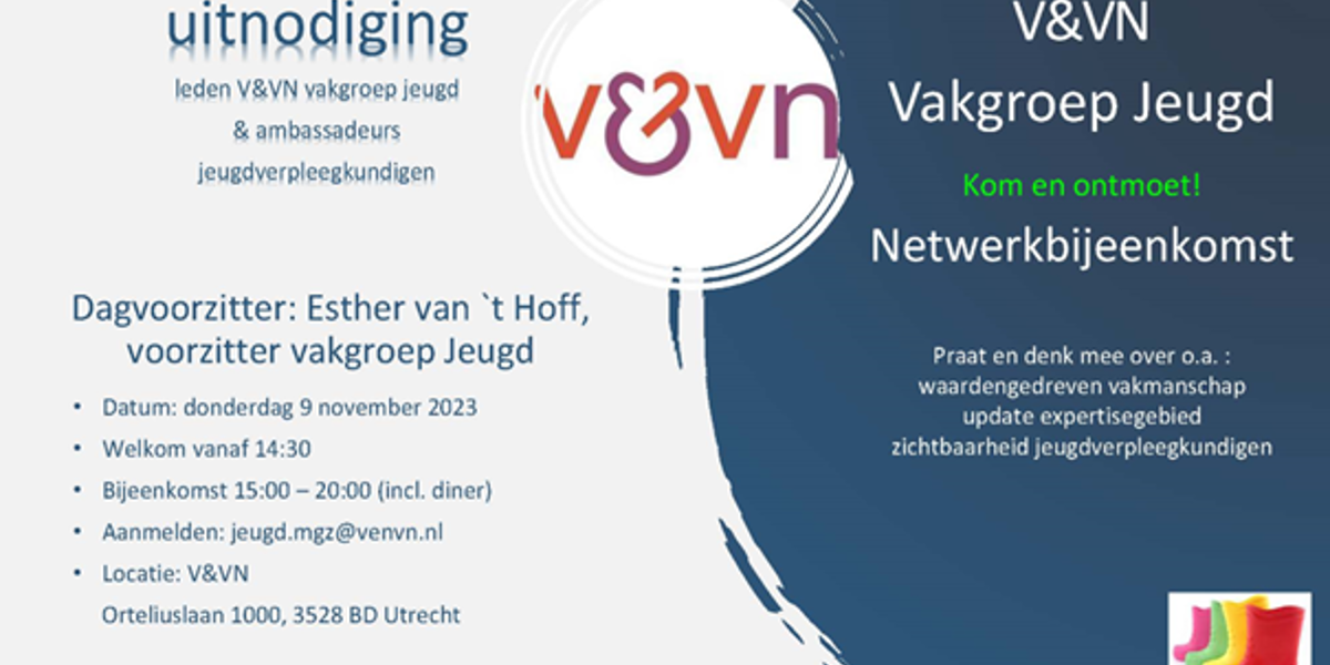 Op donderdag 9 november organiseert V&VN vakgroep jeugdverpleegkundigen M&G van 15.00 tot 20.00 uur eindelijk weer eens een live netwerkbijeenkomst bij V&VN in Utrecht. We starten om 15.00 uur, dus wees er op tijd bij. Omstreeks 18.00 uur eten we samen met daarna nog een afsluitend deel van het programma. Nadere info over het programma volgt nog vooraf of wordt op 9 november toegelicht. De bijeenkomst is voor alle leden van de vakgroep, dus ambassadeurs, wetenschappers, verpleegkundig specialisten, actieve leden en leden die actief willen worden. Mocht je nog suggesties hebben voor wie we echt nog moeten uitnodigen....laat maar weten.