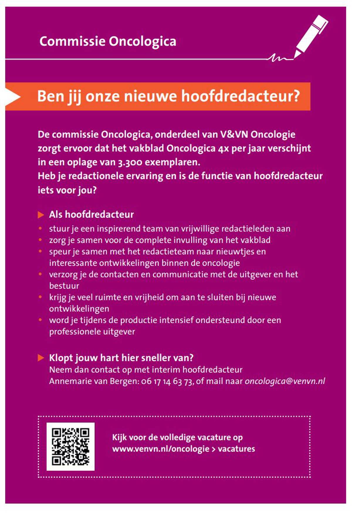 Het tijdschrift Oncologica is een uitgave van V&VN Oncologie dat vier keer per jaar in een oplage van 3000 exemplaren verschijnt en wordt verstuurd naar de leden van V&VN Oncologie. De redactie stelt het op prijs om naast vakinhoudelijke artikelen op het gebied van de oncologieverpleegkunde, informatie te ontvangen over actualiteiten (bijv. nieuwe verpleegmethoden, interventies e.d.) en reacties op artikelen.
