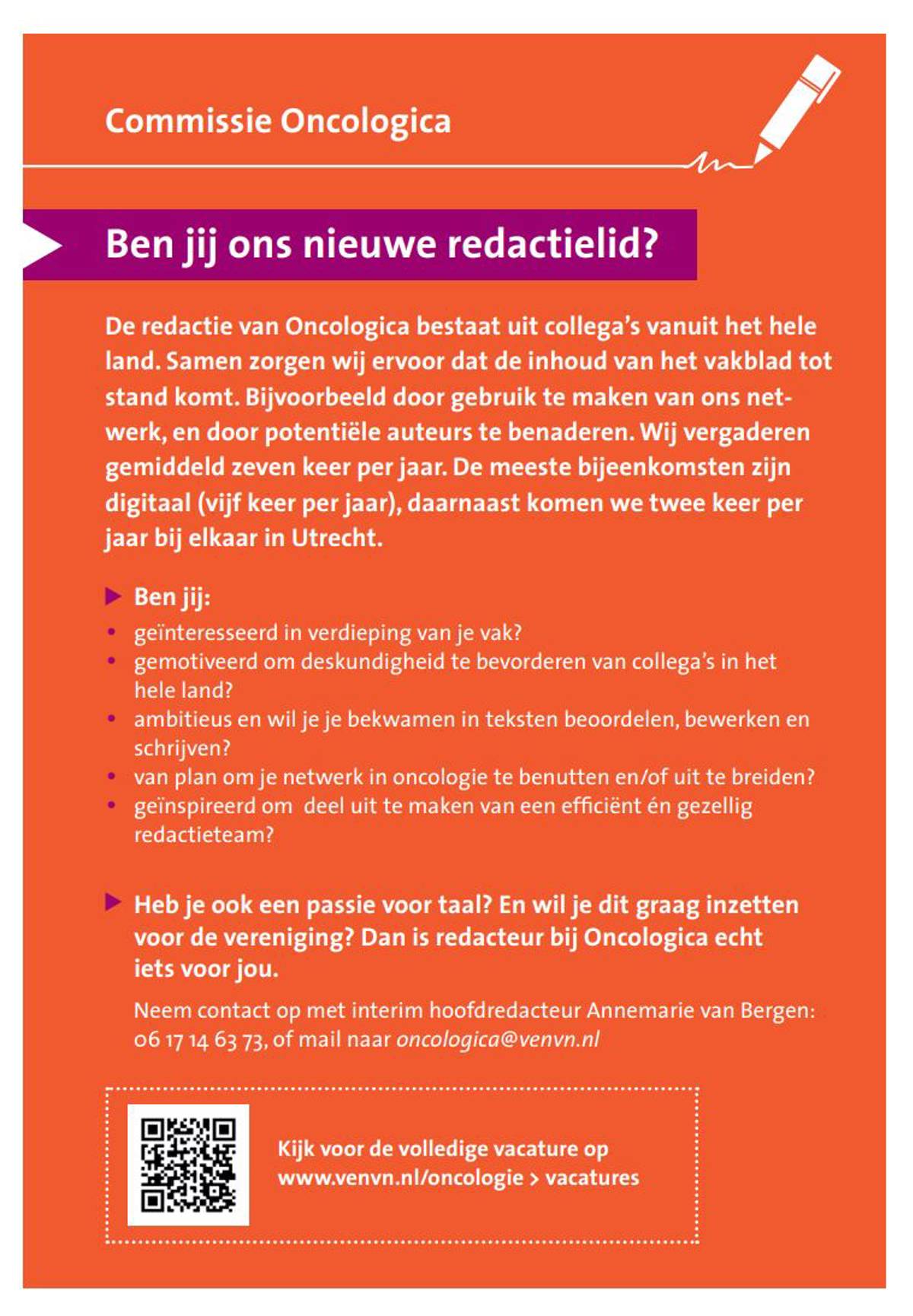 De redactie van Oncologica bestaat onder meer uit René Leijtens (adjunct-hoofdredacteur), coördinerend oncologieverpleegkundige, Franciscus Gasthuis & Vlietland Ziekenhuis, Rotterdam en Marloes de Klein, verpleegkundig specialist thoraxoncologie, Antoni van Leeuwenhoek Nederlands Kankerinstituut, Amsterdam.
