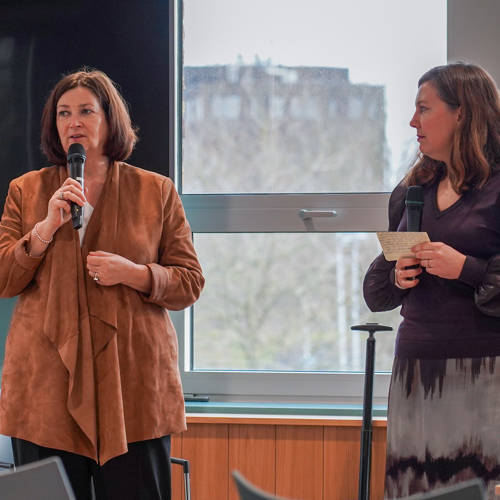 Wijkverpleegkundigen Judith Claessens (27) en Kiki Reumkens (25) gingen naar huis met de thesisprijs. Zij onderzochten de inzet van digitale hulpmiddelen in de wijkverpleging via de VirtueleThuiszorg©. “Het is fijn dat ons idee wordt gezien en dat er waardering is”, reageert Judith. “We zijn heel blij met de prijs, we hadden het niet verwacht”, vult Kiki aan. Zij gaat zich bezighouden met vervolgonderzoek.