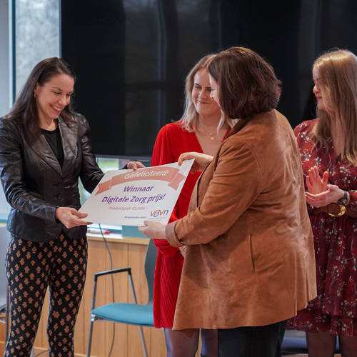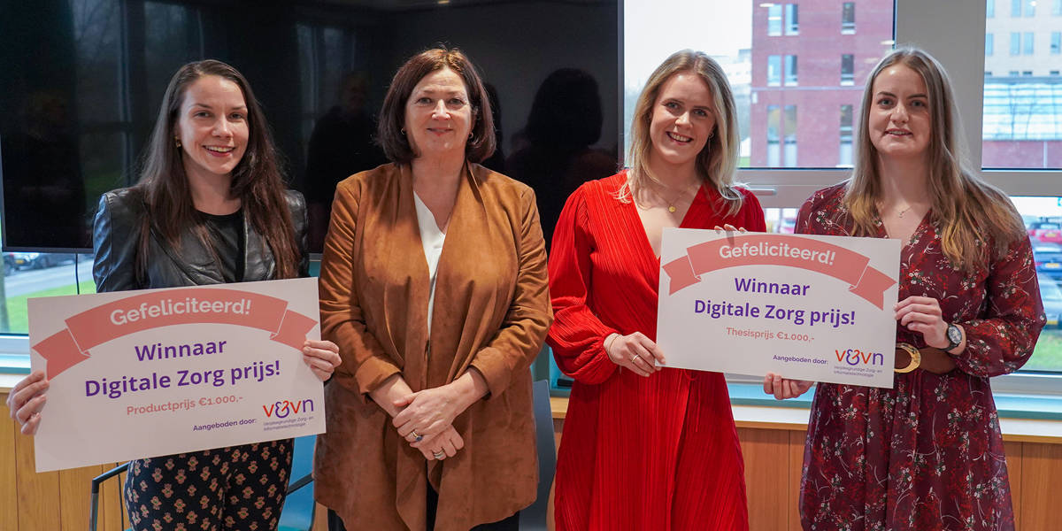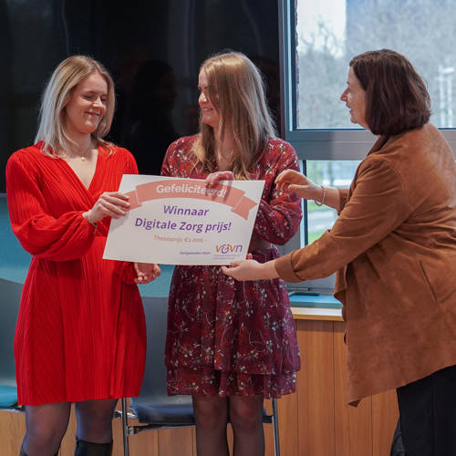 Tessa Herngreen van zorgorganisatie Nieuw Unicum en Judith Claessens en Kiki Reumkens van Zuyd Hogeschool zijn de winnaars van de Digitale Zorg Prijs 2023, een stimuleringsprijs voor studenten met een innovatief idee op het gebied van zorgtechnologie. Zij ontvingen op maandag 11 december een cheque van 1.000 euro uit handen van Conny Helder, demissionair minister voor Langdurige Zorg en Sport.