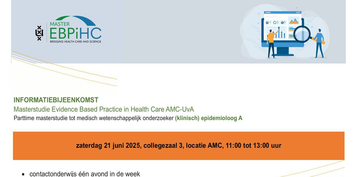 Met veel plezier nodigen we je uit voor de allerlaatste informatiebijeenkomst op 21 juni a.s. over de masterstudie Evidence Based Practice in Health Care AMC-UvA, die in september van start gaat. Tijdens deze bijeenkomst informeren we je uitgebreid over de inhoud van de studie. Dit is dé kans om alle details te horen over wat je kan verwachten, het curriculum en de mogelijkheden die de masterstudie je biedt.