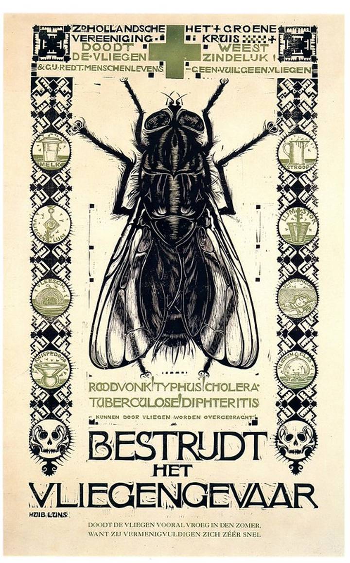 Een opvallend kunstwerk in de collectie van het Stedelijk Museum is een pamflet uit 1914, ontworpen door Huib Luns. Dit affiche waarschuwt tegen het gevaar van besmettelijke ziekten die door vliegen worden verspreid. Het ontwerp werd gemaakt in opdracht van de Zuid-Hollandse Vereeniging Het Groene Kruis en diende niet alleen om de bevolking bewust te maken, maar ook om nieuwe leden te werven.