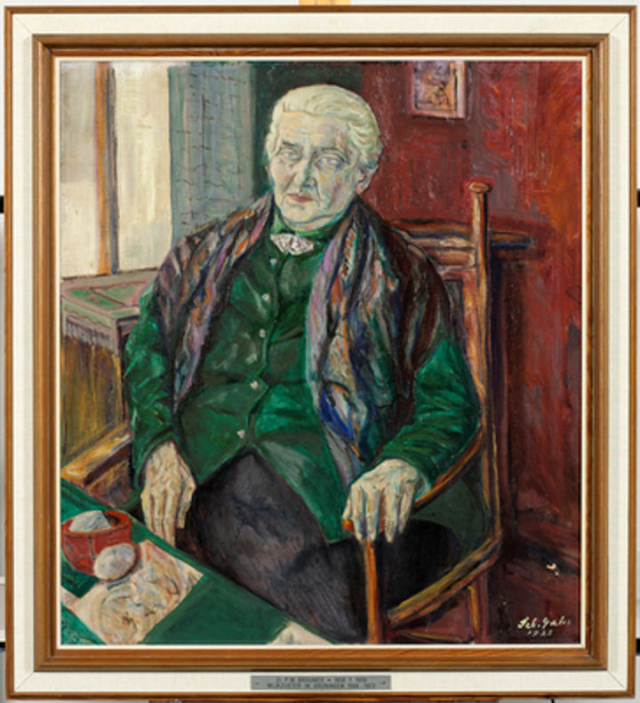 Bij het Groninger Museum vonden we op wijkzuster een bijzonder schilderij. Het laat de eerste wijkzuster van Groningen zien: mevrouw P.W. Brouwer (1858-1956). Dit werk is in 1923 gemaakt door kunstenaar Sebastiaan (Bas) Ariën Galis. Waarschijnlijk is het geschilderd ter ere van haar afscheid. Ze werkte als wijkzuster van 1906 tot 1923 en was toen 65 jaar, de pensioensleeftijd.