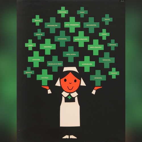 Dick Bruna, bekend als de schepper van nijntje, had een bijzondere band met de wijkverpleging. Niet via zijn beroemde konijntje, maar door zijn ontwerpen voor het Groene Kruis. Hij verbeeldde in zijn kenmerkende minimalistische stijl de verschillende aspecten van het werk van de wijkverpleegkundige.