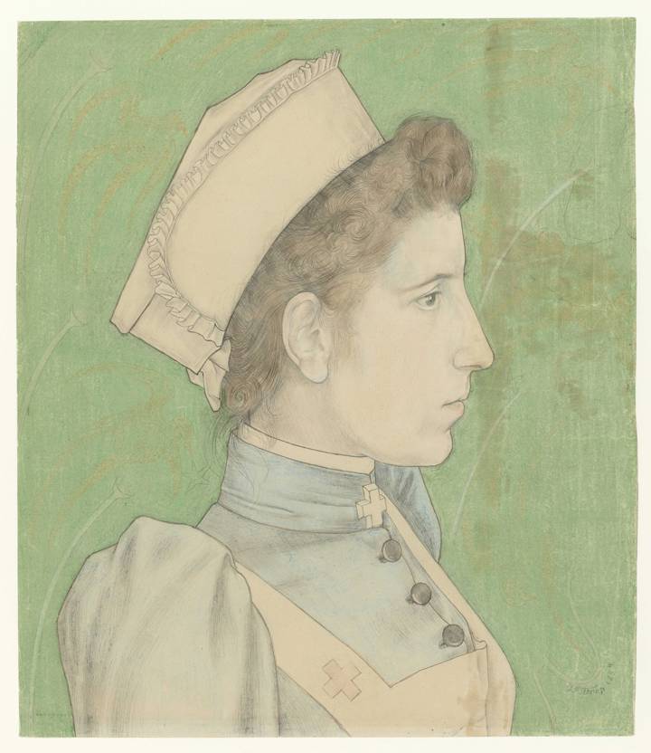 Ellen Boonstra-de Jong onderzocht de achtergrond van de (wijk)verpleegkundige op het schilderij. Haar onderzoek gaf nieuwe inzichten. Zo blijkt een veel gebruikte omschrijving dat Zuster Nelly een diacones zou zijn niet klopt. De kenmerkende strik in de hals, die bij de diaconessen hoort, ontbreekt namelijk aan haar verpleegsterskapje. Zuster Nelly heeft een rood kruisje op haar mouw, hét symbool van het Rode Kruis. Zoals de onderzoeker uitlegt op pagina 5 en 14 van haar publicatie, waren Rode Kruis-verpleegkundigen in vredestijd vaak actief als wijkverpleegsters.