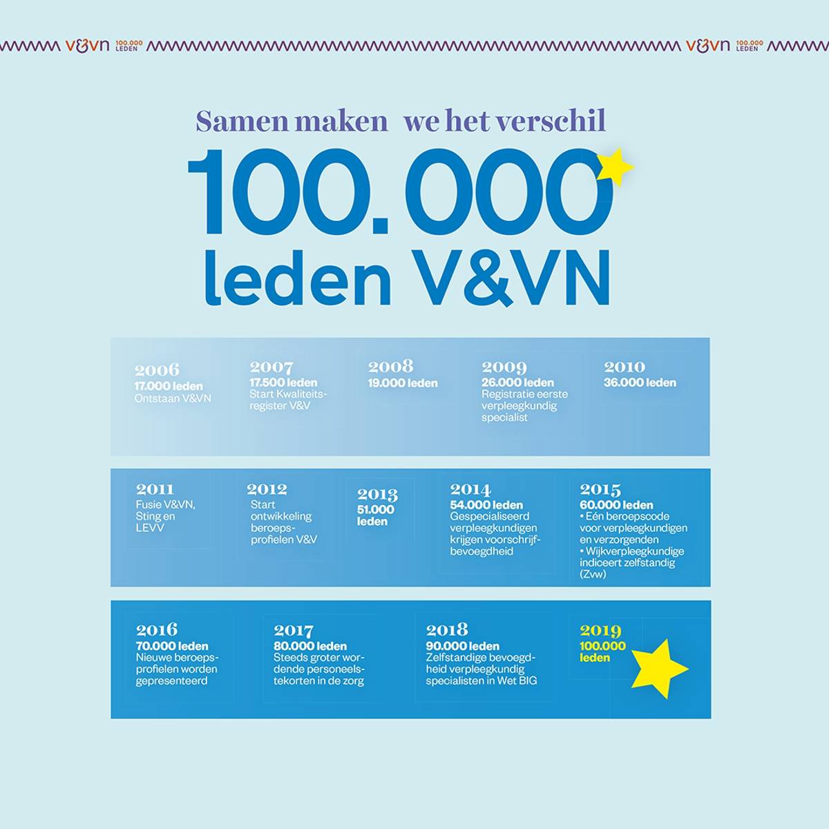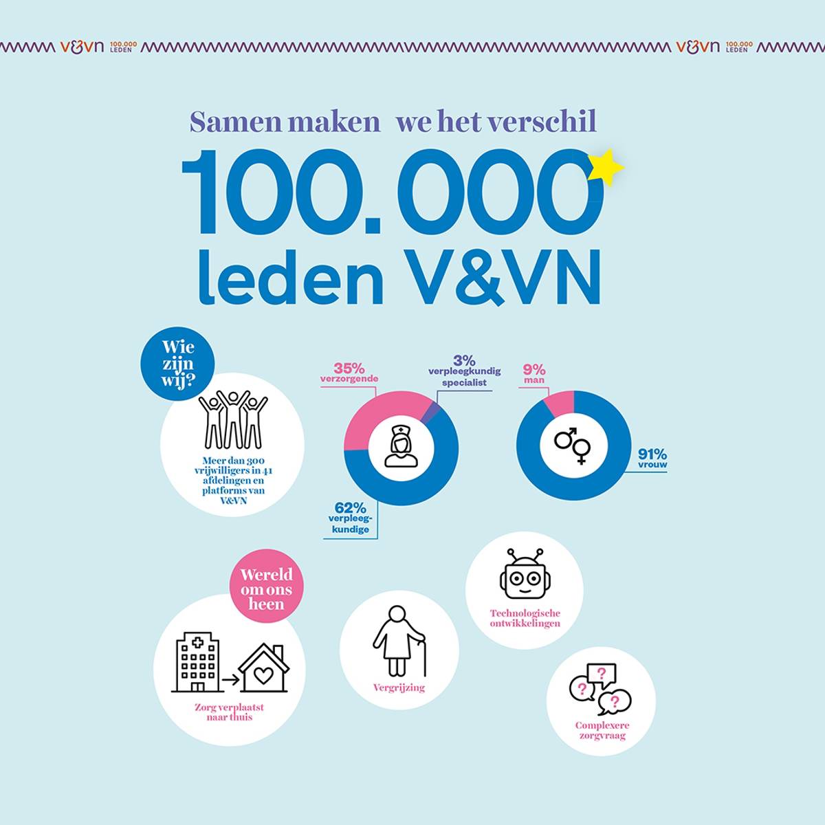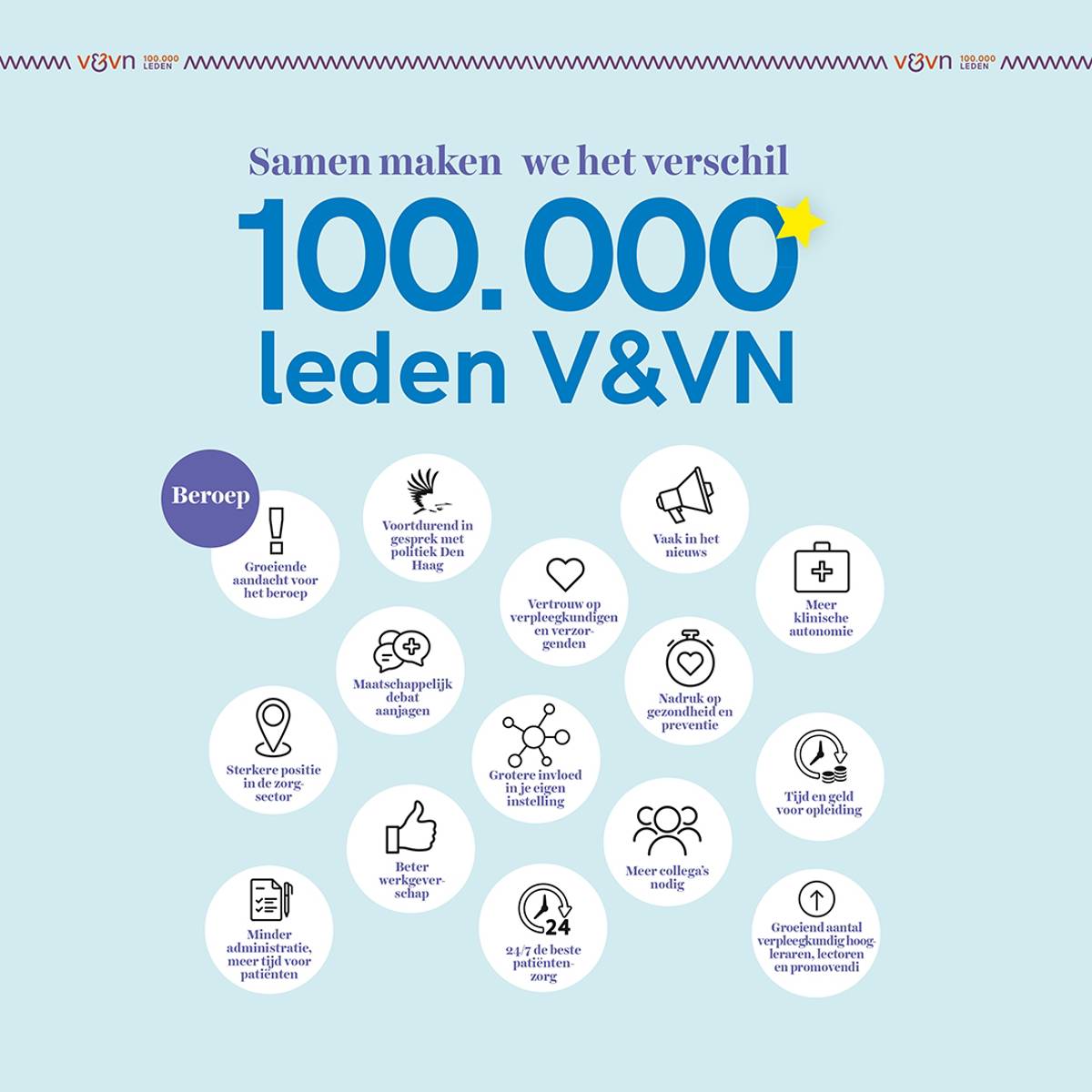 Het behalen van 100.000 leden is voor V&VN reden om de campagne: “Wij maken het verschil” op te zetten, waarin bijzondere V&VN- leden vertellen over ontroerende, heftige, bizarre en inspirerende gebeurtenissen uit hun werk. Van een verpleegkundige die het eerste hospice voor ongeneeslijk zieke jongeren in Nederland oprichtte, de Keniase verzorgende die haar kennis over de wijkverpleging over probeert te brengen in Kenia, de militair-verpleegkundige die in de meest heftige omstandigheden op missie in Afghanistan en Bosnië precies weet hoe ze moet handelen tot de ambulancechauffeur die jaarlijks duizenden wensen van ongeneeslijk zieke mensen vervult met zijn Stichting Ambulancewens.
