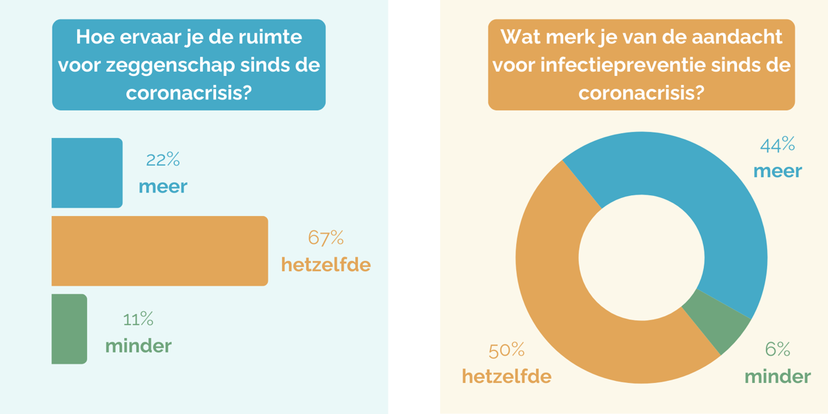 “Maar gelukkig laat deze peiling ook een positieve geleerde les zien. Kijk naar zeggenschap", benadrukt Buurman. Bijna een kwart (22%) van de verpleegkundigen en verzorgenden zegt dat er nu meer ruimte voor zeggenschap is dan voor de coronacrisis. “Eerder onderzoek toonde al aan dat juist door corona die zeggenschap groeide. En we weten dat zeggenschap een belangrijke voorwaarde is voor het behoud van zorgprofessionals. De vertrekintentie gaat dan omlaag.” Volgens 67% is de zeggenschap gelijk gebleven en 11% zegt dat er nu minder ruimte voor is.