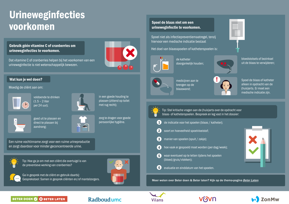 De toolkit blaas- en katheterzorg ondersteunt wijkverpleegkundige teams bij het verbeteren van blaas- en katheterzorg door stap voor stap aan de slag te gaan met handelingen bij blaas- en katheterzorg. Zo is bijvoorbeeld in vier heldere infographics samengevat welke handelingen je beter wel en niet kunt doen bij het inbrengen, de dagelijkse verzorging van een katheter of bij (het voorkomen van) een urineweginfectie.