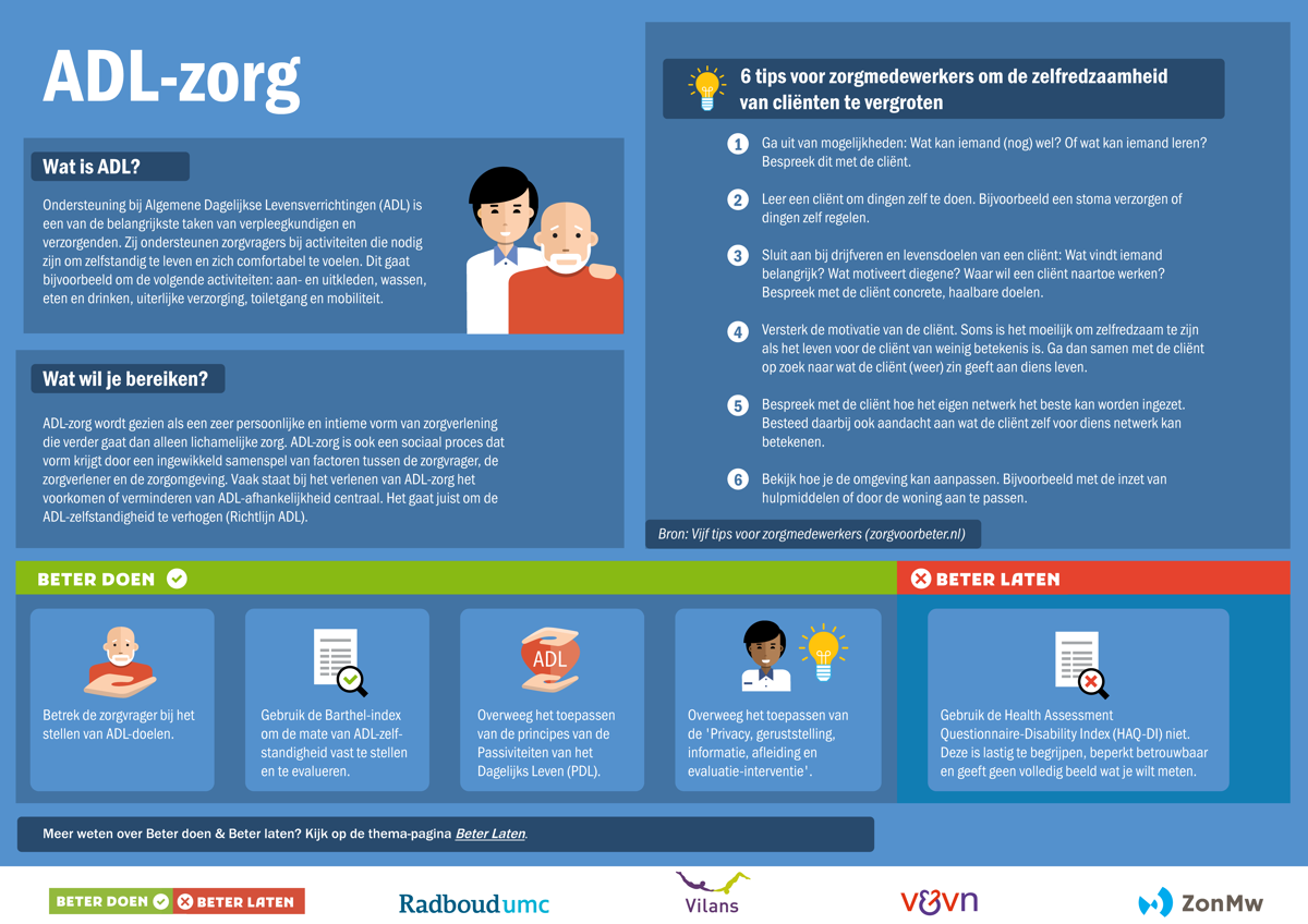 De ADL-toolkit bevat de praktische tools die je nodig hebt om gericht met je team aan de slag te gaan om de ADL-zelfstandigheid van je cliënten te behouden of te vergroten. Denk daarbij aan een helder stappenplan, een actieplan dat je kunt invullen, een infographic en een gesprekstool.
