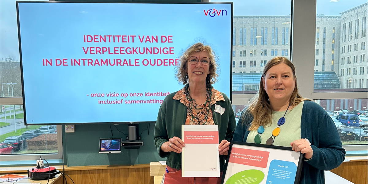 “Waar ben ik van, waar sta ik voor, en waar heb ik wat over te zeggen?” De V&VN-afdeling Geriatrie en Gerontologie hoort deze vragen vaak voorbijkomen. Vragen die te maken hebben met de identiteit van verpleegkundigen die intramurale ouderenzorg verlenen. Vragen die extra belangrijk zijn in een veranderende maatschappij die om meer kwaliteit van zorg en meer persoonsgerichte zorg vraagt. Vandaag overhandigde Anke Persoon het visiedocument ‘Identiteit van de verpleegkundige in de intramurale ouderenzorg’ officieel aan V&VN-bestuurslid Fenny Steunenberg tijdens het minisymposium ‘Samen sterk in de zorg: Verdiepen, Verbinden en Versterken’.