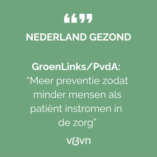 Verkiesbare politici hebben tijdens het Grote Zorgdebat - dat 21 oktober mede is georganiseerd door V&VN – veel gesproken over het belang van preventie als onderdeel van de zorg. Een suikertaks is genoemd, investeren in het sociale domein tegen eenzaamheid of het moeilijker maken voor kinderen om vapes te kopen via snapchat. “Meer aandacht voor preventie is een onderdeel dat zorgprofessionals in onze peilingen hoog op de agenda zetten. Daarom hebben we dit ook in ons verkiezingsmanifest gezet”, zegt V&VN-voorzitter Bianca Buurman.