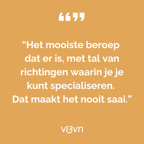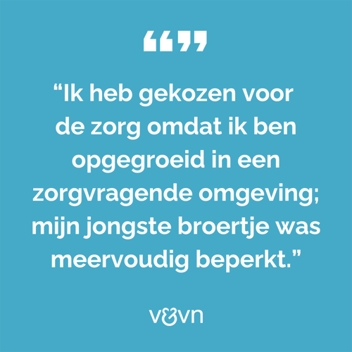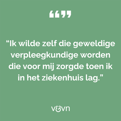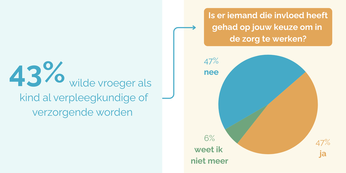 Bijna 45% van de verpleegkundigen, verzorgenden en verpleegkundig specialisten wist op jonge leeftijd al dat ze later in de zorg wilden werken. Dat blijkt uit een peiling van V&VN onder ruim 2.000 zorgprofessionals. De meeste ondervraagden noemen een persoonlijke ervaring in de omgeving als inspiratiebron: een zieke opa, een moeder die 'zuster' was, of het meehelpen zorgen voor een familielid of buur.