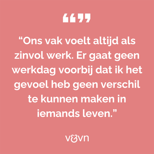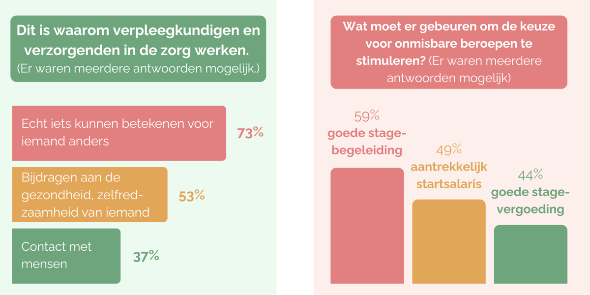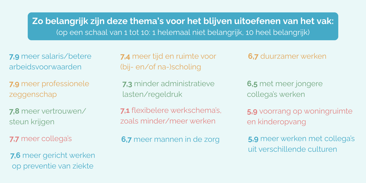 De mythe dat werken in de zorg niet leuk is, wordt ontkracht door de peiling, vertelt Buurman. “Zorgprofessionals oefenen met passie hun vak uit; 93% is trots op het vak. Bijna driekwart zegt het werk te doen omdat ze iets betekenen voor mensen op kwetsbare momenten. Ze vinden het dankbaar en motiverend werk. Ruim de helft geeft aan in de zorg te werken omdat ze zo bijdragen aan de gezondheid, zelfredzaamheid en kwaliteit van leven van hun patiënt of cliënt.”