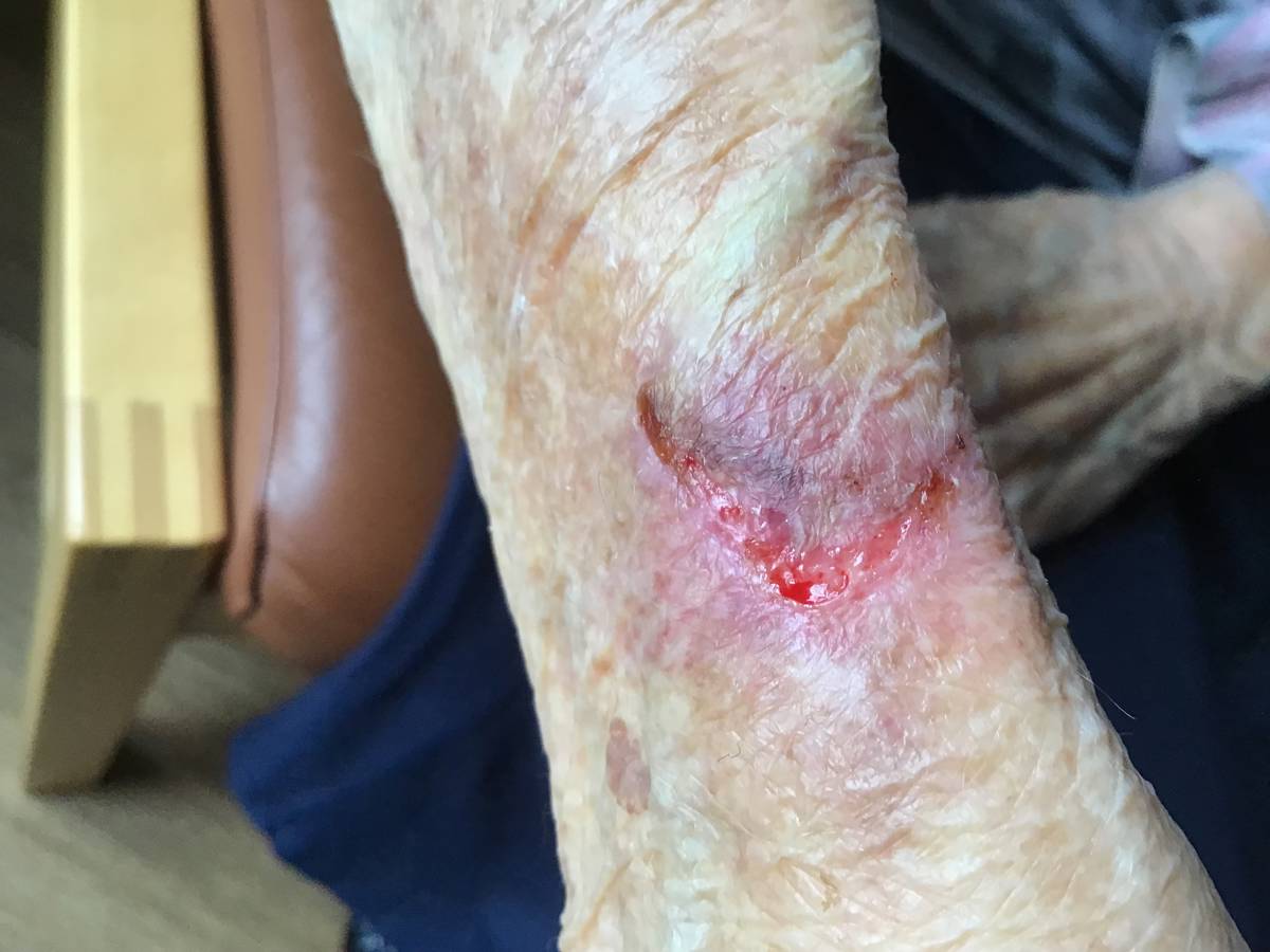 Tijdens de nachtdienst valt een vrouw van 93 jaar oud uit bed. De juiste zorgverlener is snel ter plaatse en tilt mevrouw terug haar bed in. De zorgprofessional draagt een armband en schaaft langs de huid van de cliënt. De vrouw heeft een enorm kwetsbare huid en houdt aan het voorval een schaafwond over. Ze heeft een geschiedenis met langdurige wonden, heeft diabetes en geeft na een week aan dat ze pijn heeft aan de wond.