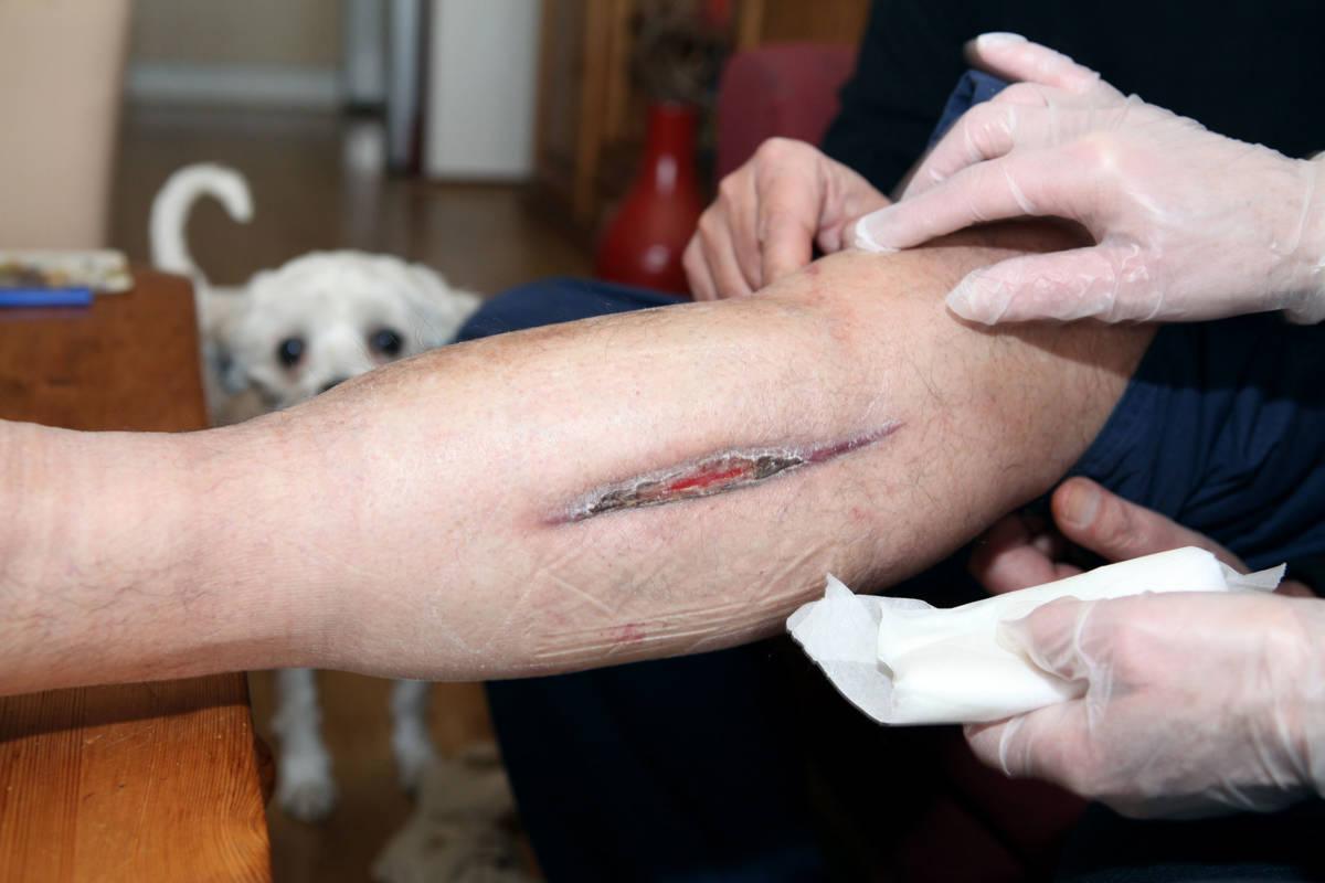 Je gaat langs bij een cliënt om zijn wond te behandelen. De cliënt kan door omstandigheden maar twee keer per week gedoucht worden. De hond van de cliënt loopt los en begint in de open box met materialen te snuffelen. Je begint met het behandelen van de wond. De vorige keer dat je hier was, maakte je materiaal open en bleef de helft over. Dit materiaal heb je goed en hygiënisch verpakt en hergebruik je nu. Je desinfecteert je handen voor het laatst terwijl je voor de deur staat om de ruimte te verlaten.