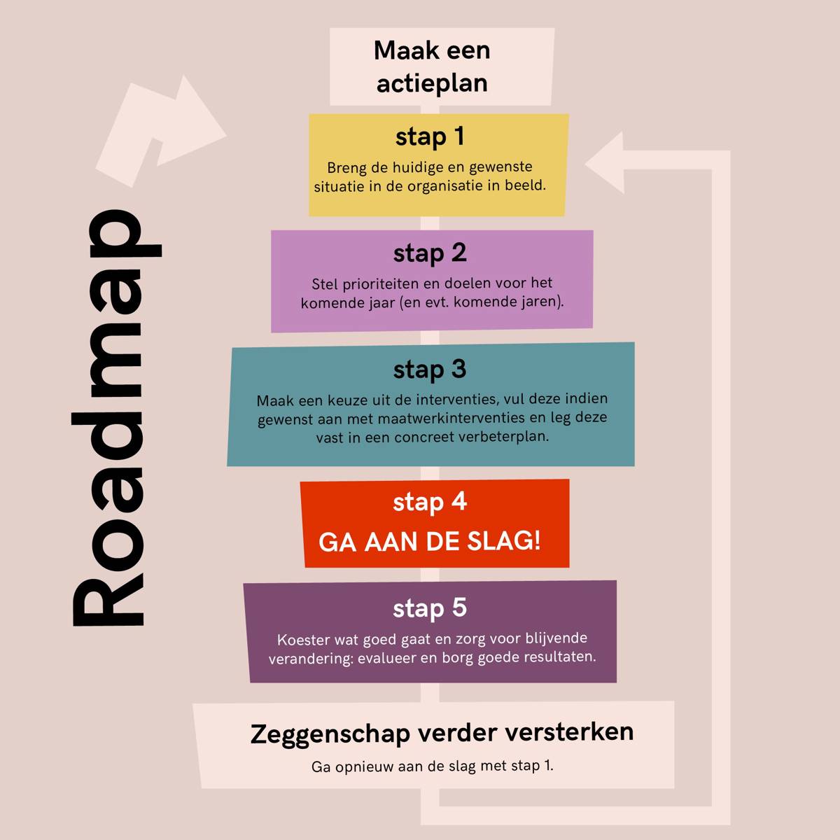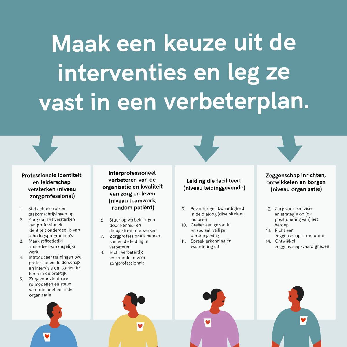 Er is geen pasklare oplossing om zeggenschap te vergroten, toch zijn er verbeterstappen die de dynamiek rond zeggenschap positief beïnvloeden. Onderdeel van de visie is een ‘roadmap’. Dat is een stappenplan met daarin 14 interventies waaruit je samen met je collega’s, leidinggevende en bestuurders keuzes kunt maken voor jouw organisatie. Margriet: “Als ik een tip kan meegeven over waar te beginnen, dan is het: denk niet dat iets niet kan of mag. Wij moeten als zorgverleners zelf initiatief en lef tonen. Sta voor je vak, oefen je zeggenschaps-skills en ga het gesprek aan in je organisatie. Stap met een goed idee op die bestuurder af. Kijk naar de goede voorbeelden die er al zijn bij andere organisaties in het land, breng de huidige situatie in kaart, maak een plan en kies je interventies. Het is ontzettend belangrijk om te beginnen en de positieve beweging in gang te zetten.”