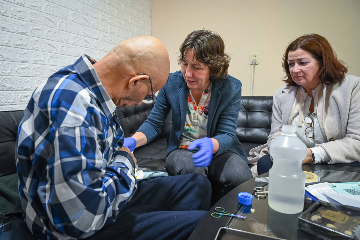 Daarna toog het duo naar een 62-jarige cliënt die de afgelopen jaren behandeld is tegen kanker. De hele zorgzame familie kwam ook even kijken vanwege het hoge bezoek. Olga: “Hij krijgt dagelijks antibiotica via een infuus en heeft ook een drain op de buik die goed in de gaten moet worden gehouden. Meneer wil heel graag dingen zelf doen en dat leren we hem ook. Hij kwam thuis met sondevoeding en kon ook dat al snel zelf aanbrengen. Het drainzakje op de buik kan hij ook nu zelf verwisselen. Zelf de regie willen hebben is heel belangrijk voor onze cliënten en daarin ondersteunen we zoveel mogelijk.”