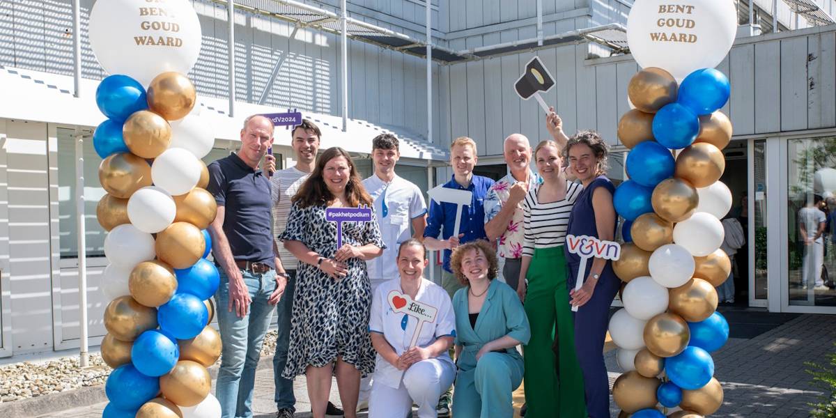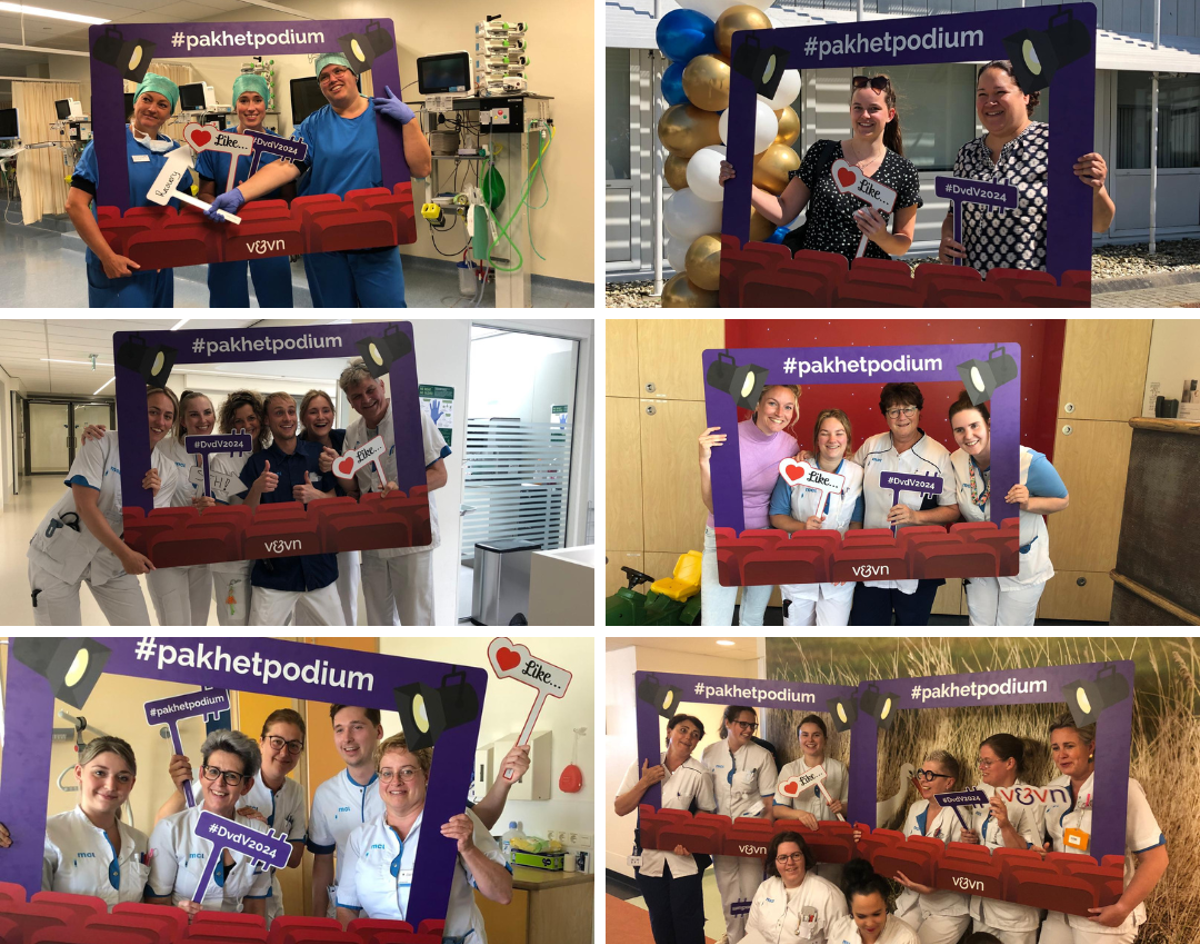 Er is veel om trots op te zijn, ziet V&VN-voorzitter Bianca Buurman tijdens het bezoek van V&VN aan de verpleegkundigen van Medisch Centrum Leeuwarden op 12 mei, de Dag van de Verpleging. Het is de aftrap van zestien werkbezoeken aan zorginstellingen in het hele land tussen 12 en 16 mei. Met de foto-actie ‘Pak het podium’ vieren de verpleegkundigen van MCL hun successen en delen ze waar ze trots op zijn. VAR-voorzitter Arno Huisman doet enthousiast mee en vertelt: “Positie innemen lukt steeds beter.”