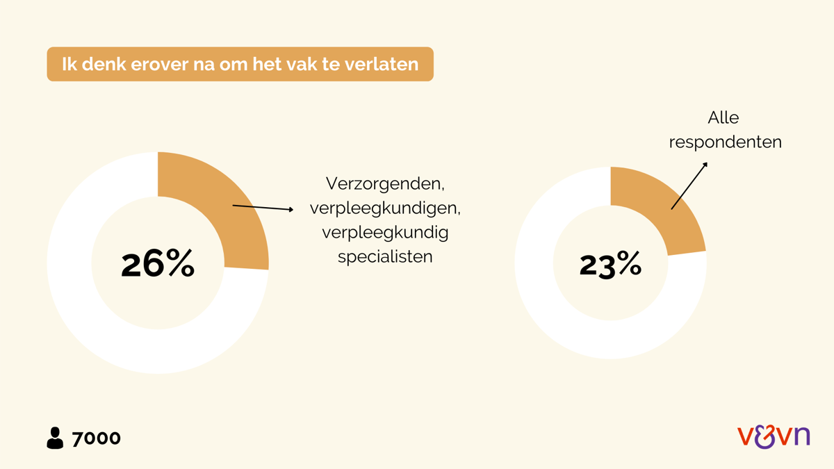 Bij 26% van de respondenten is sinds maart 2020 gepland verlof of vrije dagen ingetrokken. Daarvan heeft 67% dit nog niet kunnen inhalen. Op de vraag wat zorgprofessionals nu nodig hebben om te herstellen, geeft dan ook 34% aan dat ze vakantie nodig hebben. 43% geeft ‘Herstel privé/werkbalans’ aan, 30% wil graag andere taken oppakken zoals opleiden, en 35% geeft ‘Werklast verlaging door collega’s erbij’ aan. Op de vraag ‘Denk jij erover na om het vak te verlaten?’ geeft 9% van de respondenten aan actief rond te kijken naar ander werk. 14% geeft als antwoord ‘ja, maar geen concrete acties’. Een kwart van de respondenten heeft er over nagedacht, maar heeft nu niet de intentie om te vertrekken. 53% antwoordt op deze vraag ‘nee’, waarvan de helft aangeeft met veel plezier en passie te werken.