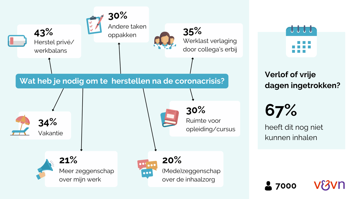 De Federatie en V&VN constateren dat herstel voor veel zorgprofessionals nu nodig is. Dit is mede van belang met het oog op de grote hoeveelheid inhaalzorg die wacht. Een van de aanbevelingen is om het werken in de zorg aantrekkelijker te maken. Volgens veel respondenten is niet alleen een hoger salaris nodig maar ook zeggenschap over de inrichting van het eigen werk.