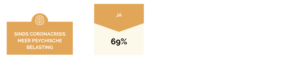 Sinds de corona-uitbraak ervaren zeven van de tien collega’s meer psychische belasting dan gewoonlijk. De belasting is het grootst in verpleeghuizen en op cohortafdelingen. De meest voorkomende klachten: vermoeidheid (vooral hoog op IC- en cohort-afdelingen), onzekerheid, stress, machteloosheid, rusteloosheid en slapeloosheid. Psychische ondersteuning via de werkgever is beschikbaar voor ruim 70 procent van de collega’s. In ziekenhuizen is dat het best geregeld, in de wijkverpleging en in de geestelijke gezondheidszorg het minst.