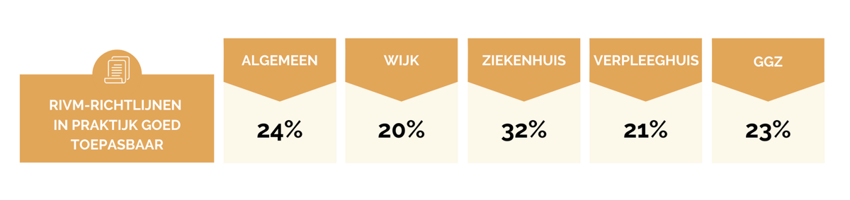 Slechts een kwart van de respondenten vindt de richtlijnen van het RIVM goed toepasbaar in de praktijk. Collega’s werkzaam in wijk en verpleeghuis zijn het meest kritisch. Volgens vier op de tien ondervraagden bieden de richtlijnen onvoldoende bescherming. Onder wijkverpleegkundigen is dat de helft.