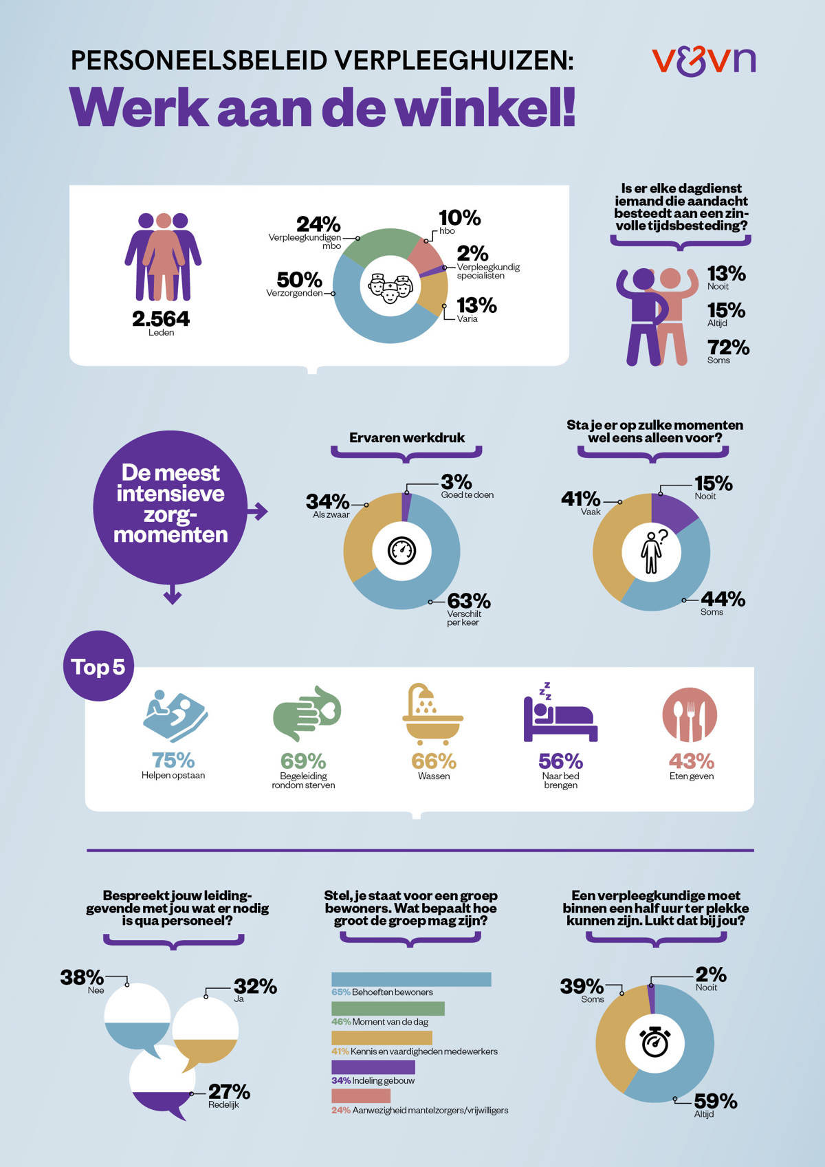 Er is werk aan de winkel als het gaat om de personeelssamenstelling in verpleeghuizen. Dit blijkt uit een peiling onder 2.564 verpleegkundigen en verzorgenden. De peiling is uitgevoerd om input op te halen voor de Stuurgroep Kwaliteitskader Verpleeghuiszorg. Hierin werkt V&VN met onder andere Actiz samen aan het verbeteren van de kwaliteit van zorg in verpleeghuizen. Uitgangspunt is dat het personeelsbeleid beter afgestemd wordt op de wensen van bewoners.