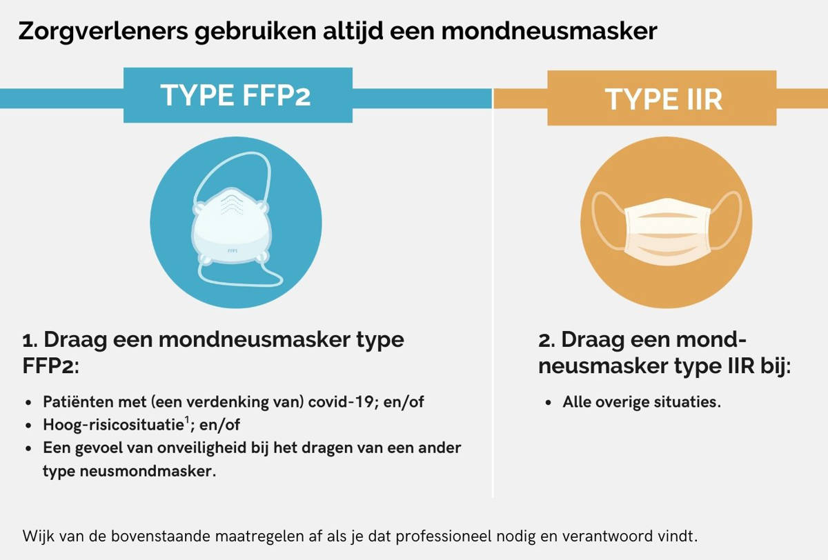 De leidraad schrijft voor dat zorgverleners een FFP2-masker dragen bij contact of werken met patiënten met COVID-19 of een verdenking daarvan. Hetzelfde geldt voor contact of werken met patiënten in hoog-risicosituaties. Daarnaast kan een FFP2-masker worden gedragen als de zorgprofessional een gevoel van onveiligheid ervaart bij het dragen van een ander type mondneusmasker dan FFP2. In alle overige situaties wordt een IIR-masker ingezet.
