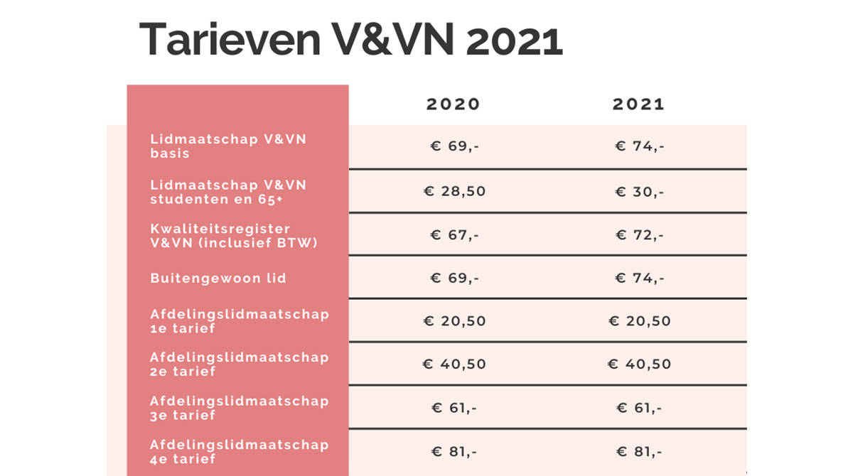 Vanaf 2021 hanteert V&VN de volgende tarieven: