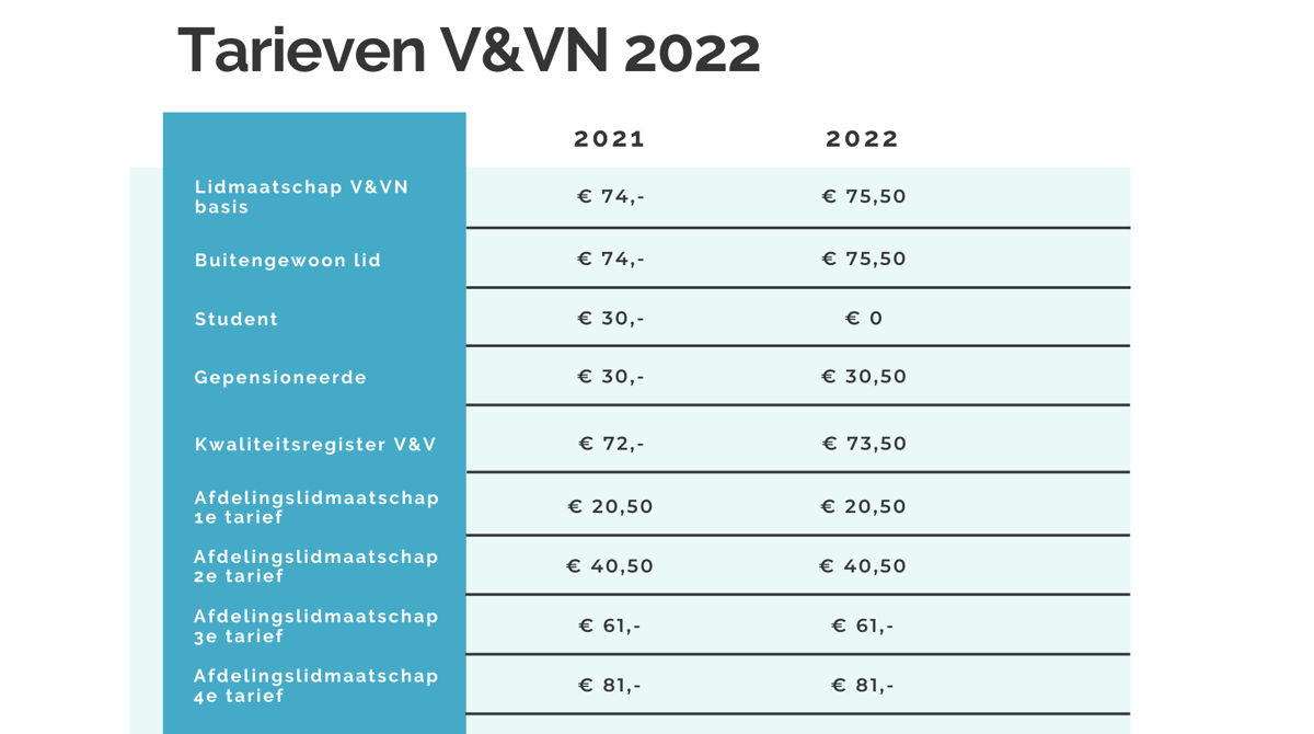 Vanaf 2022 hanteert V&VN de volgende tarieven: