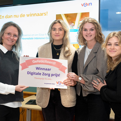 30. 74 piepjes per uur! Uit handen van minister Fleur Agema van VWS ontvangen drie studenten Verpleegkunde aan Hogeschool Windesheim de Digitale Zorg Prijs 2024 voor hun scriptie over de overmatige hoeveelheid alarmen op de neonatale intensive careafdeling (NICU).