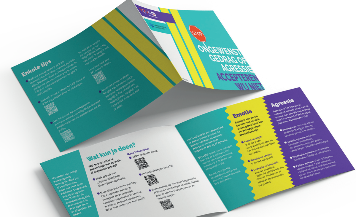De voorzitter, die zelf ook werkzaam is op de ambulance, vervolgt: “Maar incidenten met agressie of (verbaal) geweld moeten we echt niet interpreteren als onbeduidend of gaan afzwakken. Er wordt nog te vaak gezegd dat agressie bij het werk hoort. Of dat het nou eenmaal vaak gaat om personen die psychisch niet in orde of onder invloed van drugs of alcohol zijn. Een veilige werkomgeving voor ambulancezorgprofessionals en patiënten is belangrijk. Daarom hebben we de agressieflyer -samen met de AZN ontwikkeld- met tips voor de zorgverlener die te maken krijgt met ongewenst gedrag.”