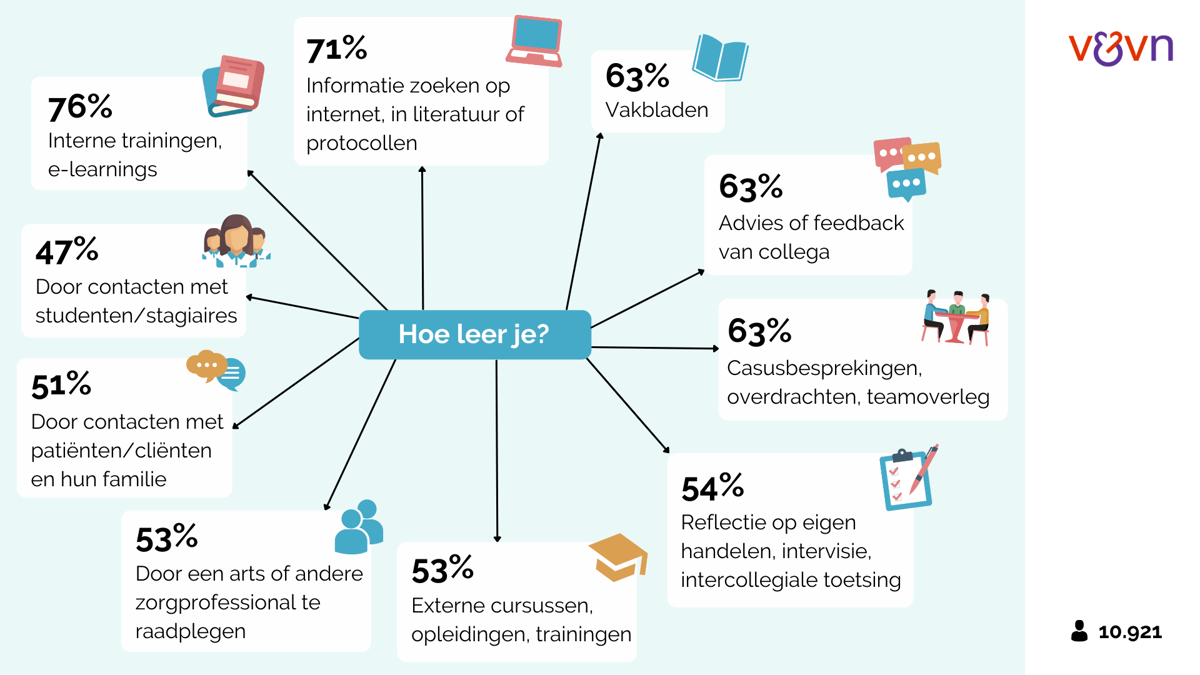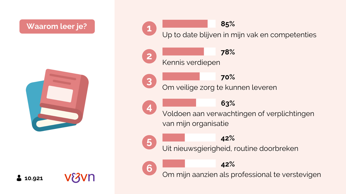 Driekwart van de verpleegkundigen en verzorgenden wil een individueel scholingsbudget. Op dit moment beschikt slechts een kwart hierover. De grootste belemmeringen voor leren en ontwikkelen? Door de hoge werkdruk is er nauwelijks tijd voor, zegt 42%. Ook zijn scholingen te duur (37%) en is er te weinig scholingsbudget (21%). Met afstand de belangrijkste motivatie om te leren is om up-to-date te blijven, kennis te verdiepen en veilige zorg te kunnen leveren. Dit blijkt uit een peiling onder V&VN-leden waar 10.921 verpleegkundigen en verzorgenden aan mee hebben gedaan.
