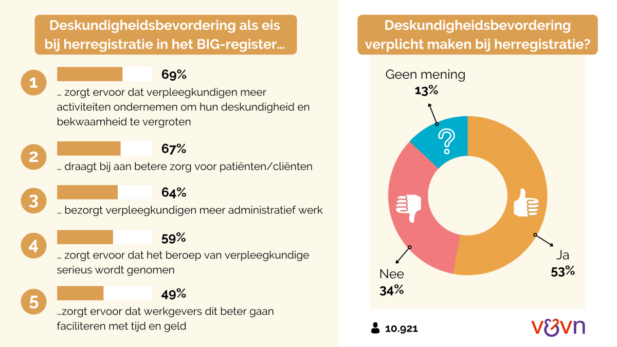 Moet deskundigheidsbevordering een eis worden bij herregistratie in het BIG-register (o.a. voor verpleegkundigen)? Over de wenselijkheid van zo’n wettelijke verplichting zijn de meningen verdeeld: 53% is het ermee eens, 34% niet. Volgens een meerderheid van verpleegkundigen kan een wettelijke verplichting bijdragen aan betere zorg (67%) en aan het aanzien van het beroep (59%), ook kan het ervoor zorgen dat verpleegkundigen meer activiteiten ondernemen om hun deskundigheid en bekwaamheid te vergroten (69%). Bijna twee derde denkt echter dat een verplichting leidt tot meer administratief werk.