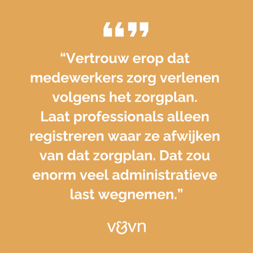 Veel zorgprofessionals hebben last van onnodige registraties en roepen op tot vereenvoudiging, zodat ze daar minder tijd aan kwijt zijn. Leden geven aan dat ze zelf administratieve lasten moeten kunnen aangeven en verlagen. Ze willen daarover meer zeggenschap. Vertrouwen in de zorgprofessional moet het uitgangspunt zijn.