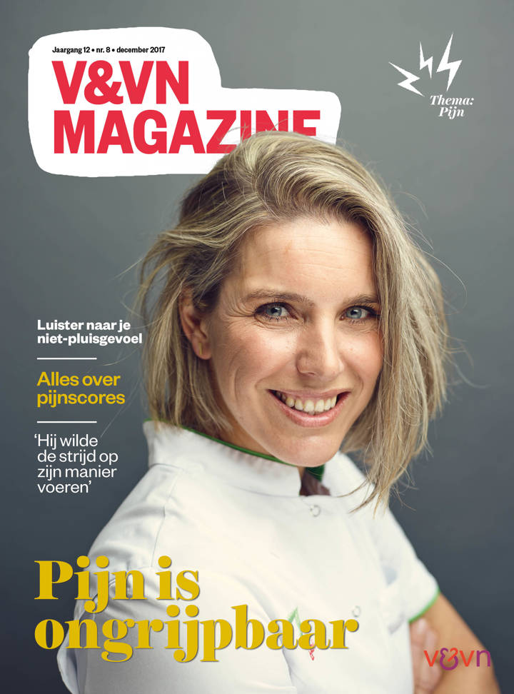 ‘Pijnpatiënten hebben soms het idee dat ze gek zijn, dat het tussen de oren zit. Maar dat kan helemaal niet. Die pijn is er echt!’ Dat zegt pijnverpleegkundige Martine Kos (cover) in het nieuwe V&VN Magazine over pijn. In Nederland hebben ruim twee miljoen mensen chronische pijn. Maar er is nog veel onbekend. Pijn is subjectief, moeilijk te meten. Daarom is het maar goed dat we pijnscores hebben. Maar, de huidige manier waarop we pijn scoren schiet ook vaak zijn doel voorbij. Welke ontwikkelingen zijn er op het gebied van pijn? En hoe ga je om met pijn bij kwetsbare groepen? Tijd voor een gesprek over pijn.