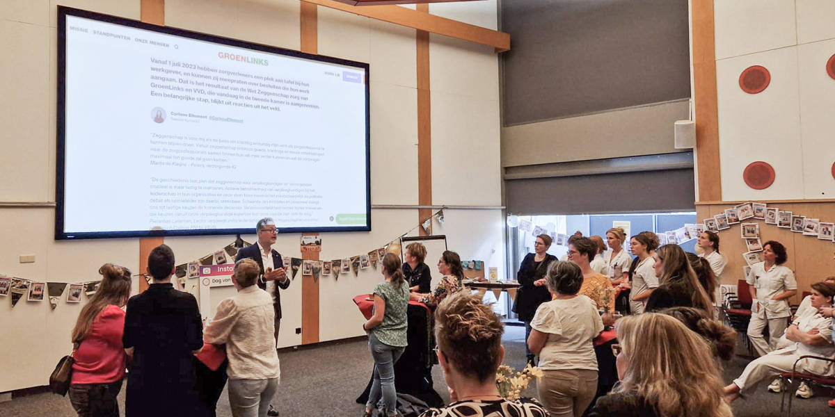 Een ander zegt dat het slagen van meer zeggenschap ook afhangt van het meekrijgen van collega’s. Dat is soms lastig. “Óf ze zijn met andere dingen bezig, óf ze hebben geen tijd.” “Wij pakken die tijd, steeds meer”, reageert een aanwezige. “Maar je bent daarbij afhankelijk van een management dat leiderschap en zeggenschap wil faciliteren.” Een sociaal psychiatrisch verpleegkundige: “Ik ben van de actie. Mijn cliënten zijn leidend, en niet de protocollen. Gaan we niet vooruit, dan maak ik me sterk voor een andere aanpak. Als dat goed uitpakt, wordt het gezien in de organisatie.” Haar assertiviteit werd zelfs landelijk opgemerkt. “Ben je ineens in gesprek met een Kamerlid.”