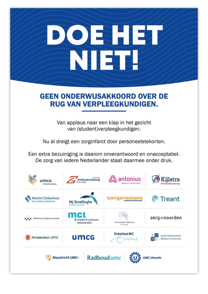 De groep verpleegkundigen laat zien dat de zorgen over de bezuiniging ook in de praktijk leven. Zij ondernamen actie en kwamen een brief brengen tegen de bezuinigingen, met als motto: geen onderwijsakkoord over de rug van verpleegkundigen. Onverwacht werd vorige week bekend dat een financieel knelpunt in de onderwijsbegroting bezuinigingsgevolgen had voor de begroting van VWS.