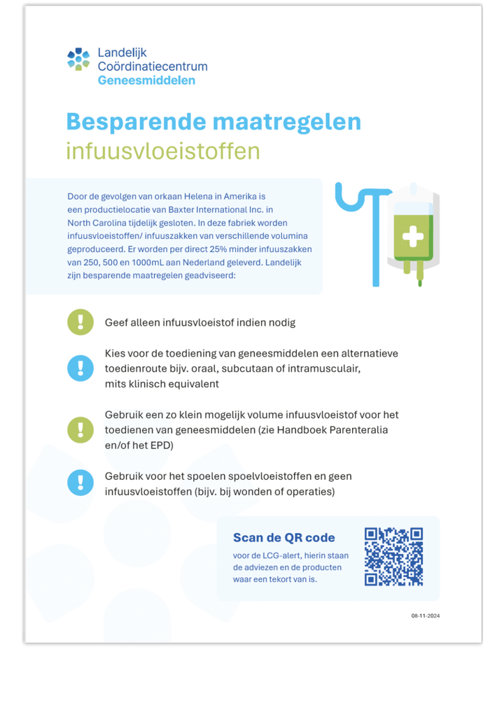 Om het dreigende tekort aan zakken met infuusvloeistoffen in met name ziekenhuizen tegen te gaan, moet hiermee spaarzamer worden omgegaan. Het Landelijk Coördinatiecentrum Geneesmiddelen heeft een poster ontwikkeld met daarop vier maatregelen die moeten leiden tot bewustwording op de werkvloer.