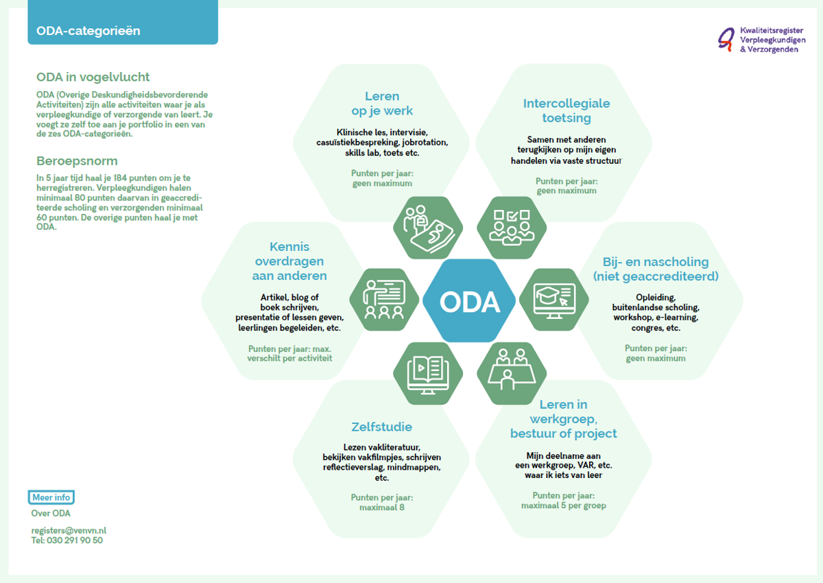 In je portfolio heb je twee soorten activiteiten: geaccrediteerde scholing en ODA, overige deskundigheidsbevorderende activiteiten waar je als verpleegkundige of verzorgende van leert. ODA kun je zelf bijschrijven in je portfolio in het Kwaliteitsregister in de volgende categorieën: