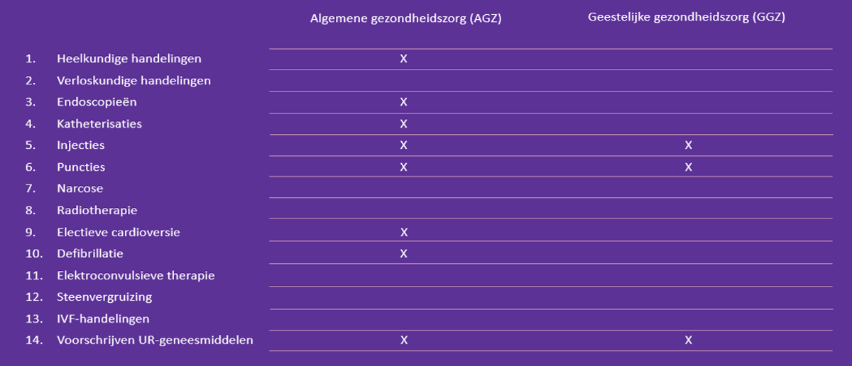 - Voor ieder beroep is bepaald tot welke voorbehouden handelingen zij bevoegd zijn.