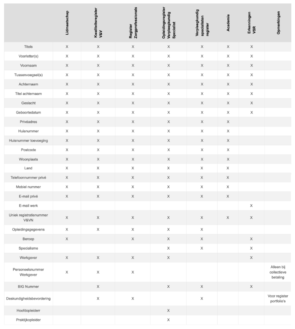 V&VN gebruikt je gegevens om de diensten te verlenen die je bij ons afneemt. In onderstaande tabel kun je per dienst zien welke gegevens we van je verwerken. Afdelingen of platforms van V&VN kunnen soms aanvullende informatie vragen. Een overzicht van deze aanvullende gegevens vind je hier.