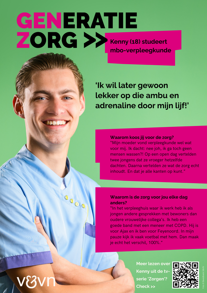 Help je mee om de jongste generatie te motiveren voor een baan in de zorg? Deel bijvoorbeeld dit portret op je eigen social-mediakanalen of geef een gastles op een basis- of middelbare school. De toolkit met lesmaterialen blijft beschikbaar. Ook kun je fysieke campagnematerialen aanvragen, zoals posters en stickers (zolang de voorraad strekt).